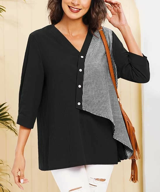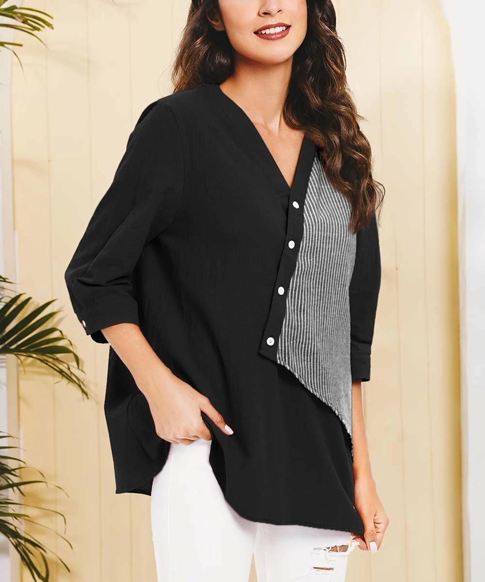 Get set for shifting temperatures with this v-neck top flanked by three-quarter bishop sleeves. Buttons draw the eye to the mod contrast drapery effect.