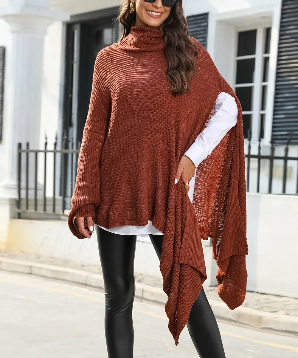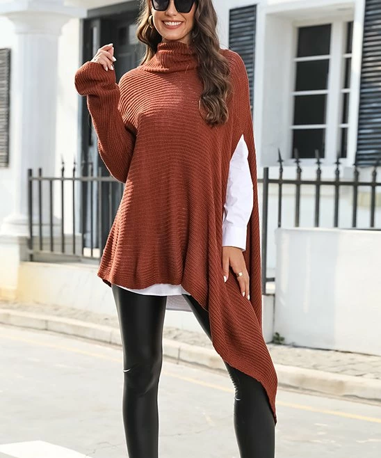 Stay cozy as you slip on this asymmetrical turtleneck poncho featuring a split side with a cascading drape.