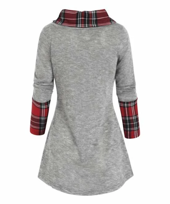 Enhance your cool temperature wardrobe with this cozy tunic boasting a cowl neckline and subtle button accents. Classic plaid details and a curved hem add extra charm to the look.