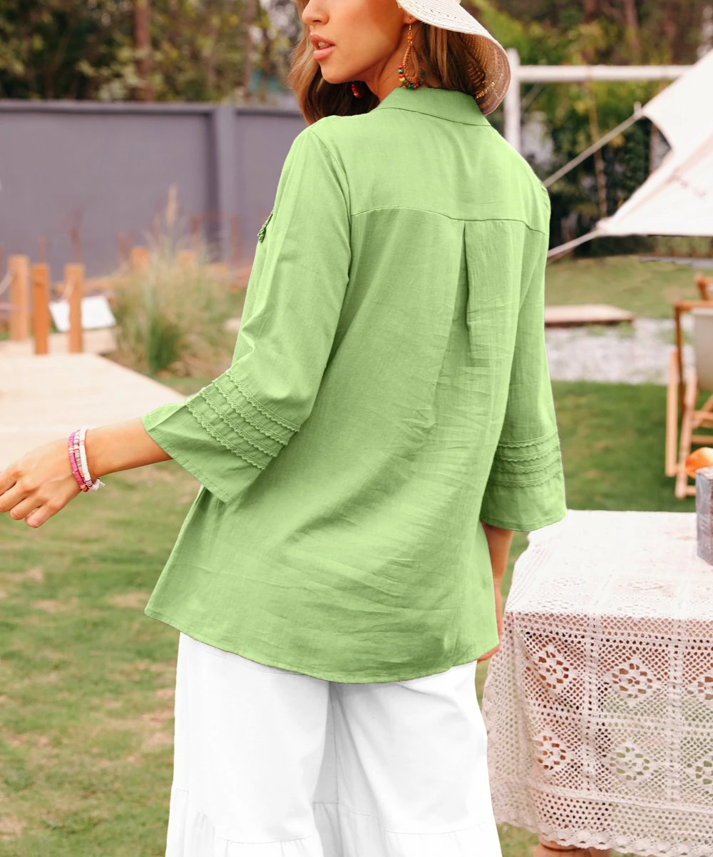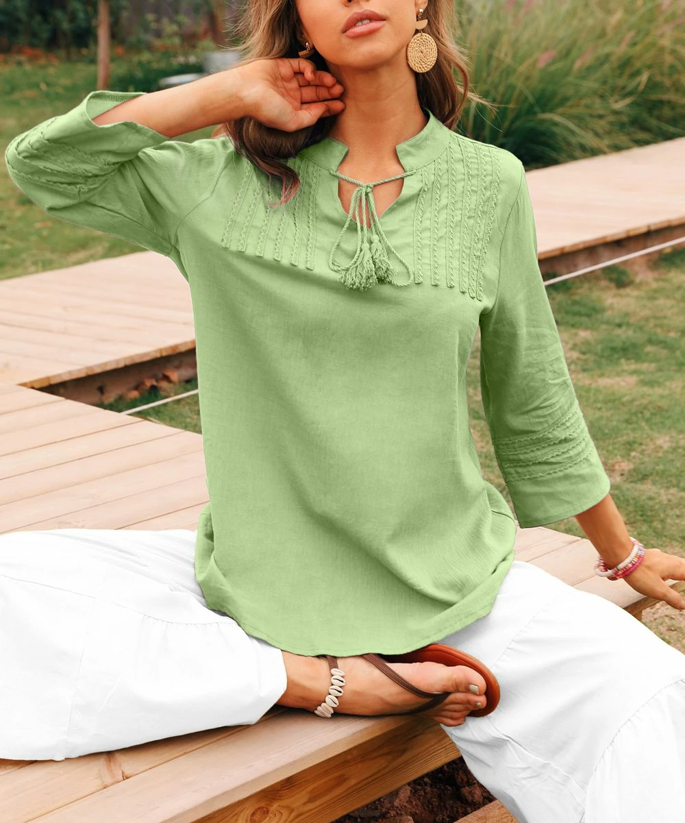 Embrace boho-inspired comfort in this relaxed top featuring three-quarter length sleeves for coverage and a soft, breathable cotton blend. Embroidered detail and a tie at the notched neckline add whimsical poise.