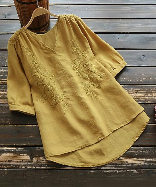 With subtle embroidered floral detail, this hi-low top features a flattering v-neck that’s easy to dress up or down.