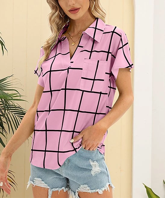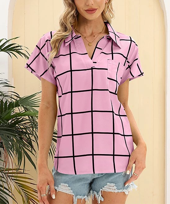 Pull off polished preppy style with this top that shows off a classic print and a notch neck framed by a bal collar. A chest pocket awaits small items like your lipstick and keys.