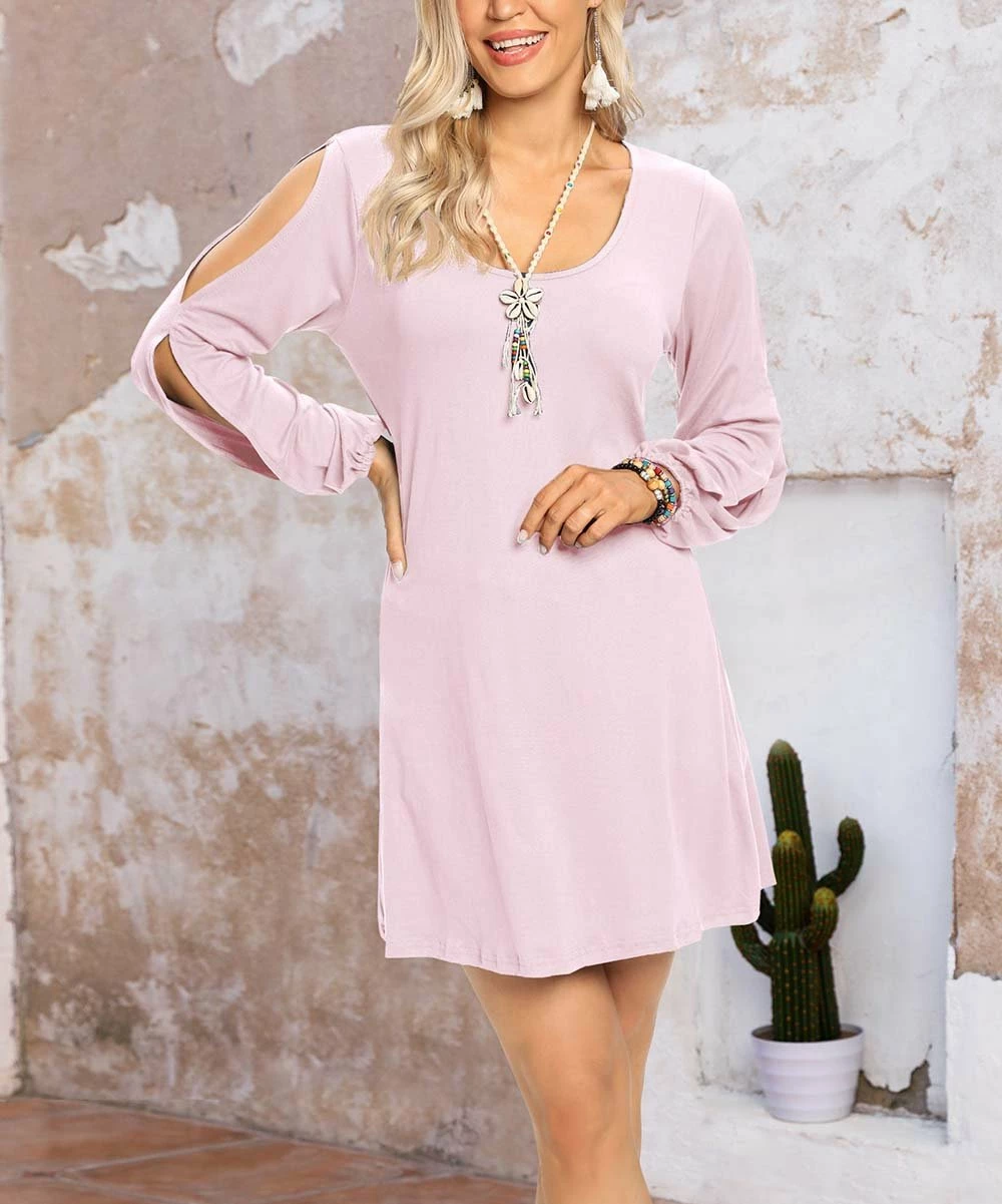 Long sleeves with cutout details combine with a flattering scoop neckline in this playful, easily accessorized, little pink dress. Crafted from a breezy cotton-poly blend.