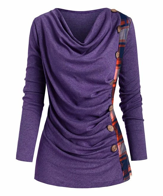 Pack preppy plaid into your weekend look with this tunic that shows off a contrast side panel offset by decorative buttons. A cowl neck and draped body give the piece a fluid, feminine profile.