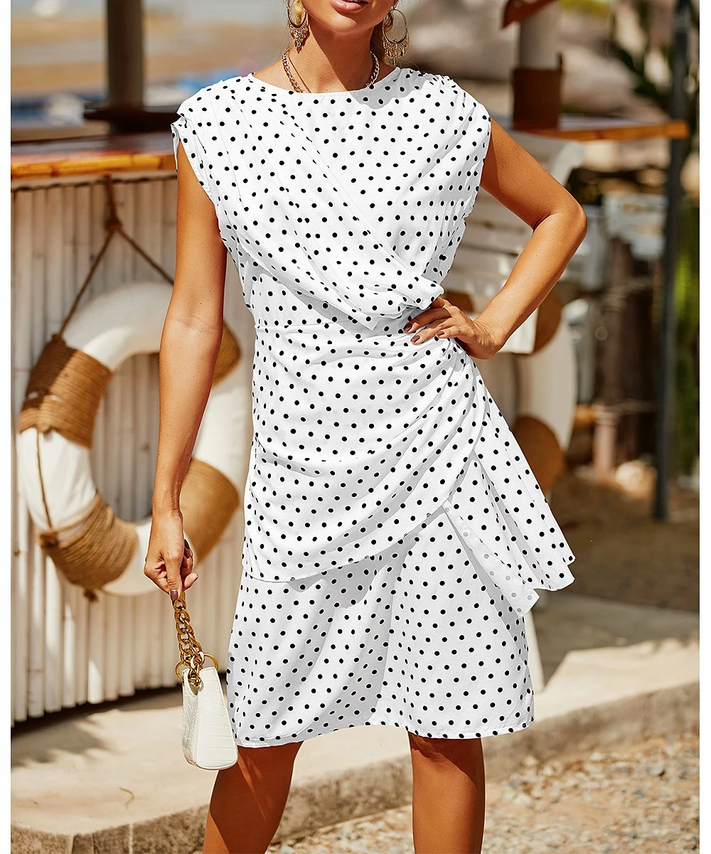 Take on the day in style with this dress featuring a side-wrap construction and a timeless dot print.