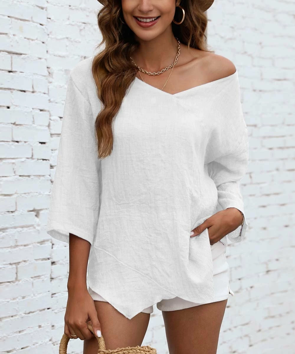 A handkerchief hem and three-quarter sleeves lend a sporty flair to this top.