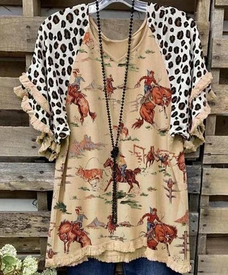 Get ready to wow in this boho-infused top. The cut is flowy and accented with fringe while the combination of animal and rodeo prints is simply wild.